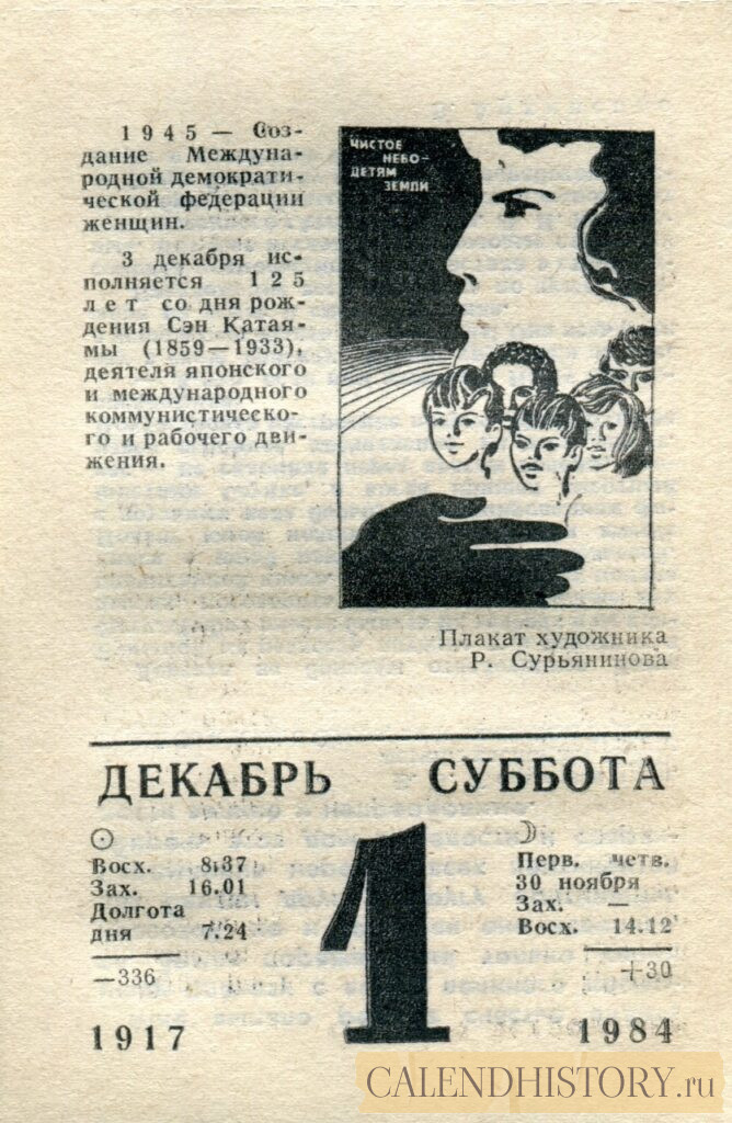 Итак, сегодня 1-го декабря и у нас на календаре 1984-й год. Перед нами листок советского календаря для женщин за этот день. На календаре у нас суббота - 1 декабря 1984-го года. ЧИСТОЕ НЕБО — ДЕТЯМ ЗЕМЛИ
