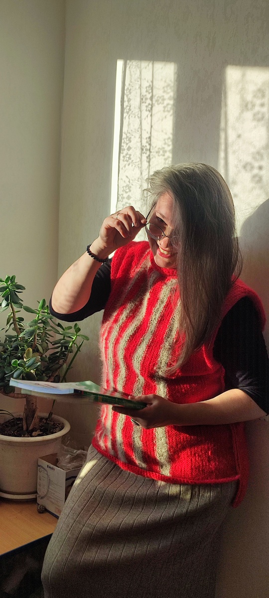 После того как связала новую жилетку. Итак, за 4 дня можно сказать, готов жилет. Хочу тему эту раскрыть, потому, что это слияние двух родов моей семьи. Род мамы и папы. Идея вязать пришла давно, видимо ждала зимы... Приходилось постоянно прерываться на дела, но это не сломило идею, наоборот! Как же приятно было наконец взять и завершить этот проект! Идея рисунка и распределения цветов пришла по ходу вязания. Было у меня 6 мотков махера маминого и интуитивно подумала, что мне может немного не хватить, а может и одну четвёртую. Так и вышло потом после вязания. Поэтому включила собачью шерсть! Шерсть друга! Если Махер, это красный, то шерсть друга как мой цвет волос. Связала, махера тика в тику! Более подробнее про вязание здесь: После окончания работ, мой фотограф, старшая дочь, придумала мне образы, с которыми по её мнению я в этом жилете иду в унисон. И учительница истории я у неё и английского, и студентка-ботаник, и просто ассистент! В итоге, фотосессия у нас прошла и