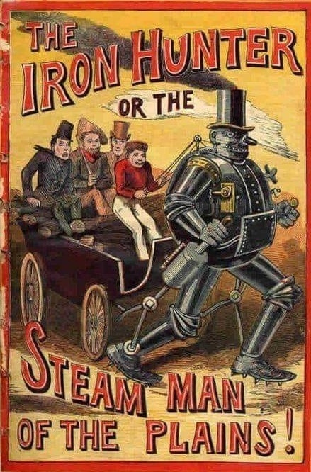 Верхняя картинка - это карикатура, хотя... В 1869 году в Чикаго демонстрировался экипаж, который тянул паровой человек. Среда, 17 февраля 1869 года. С 10 утра до 10 вечера в Чикаго, крупнейшем городе мира, будет проходить увлекательное и почти невероятное зрелище — демонстрация паровой машины, способной проехать милю за 2: 15. Эта машина, известная как «Паровой человек», уже демонстрировалась в Нью-Йорке и Бостоне. Она станет одним из самых ярких событий в Чикаго, привлекая внимание самых умных и изобретательных людей со всего мира. Корпус «Парового человека» содержит котел, расположенный внизу. На спине он несет две колебательные машины, соединенные цепями, которые приводят в движение ноги. Плоские пружины обеспечивают возвратно-поступательное движение, а резервуар для воды и угольный отсек расположены под днищем каретки, прикрепленной к паровому человеку. Механизм управления находится перед машинистом и напоминает тот, что используется на локомотивах. Это позволяет легко регулировать