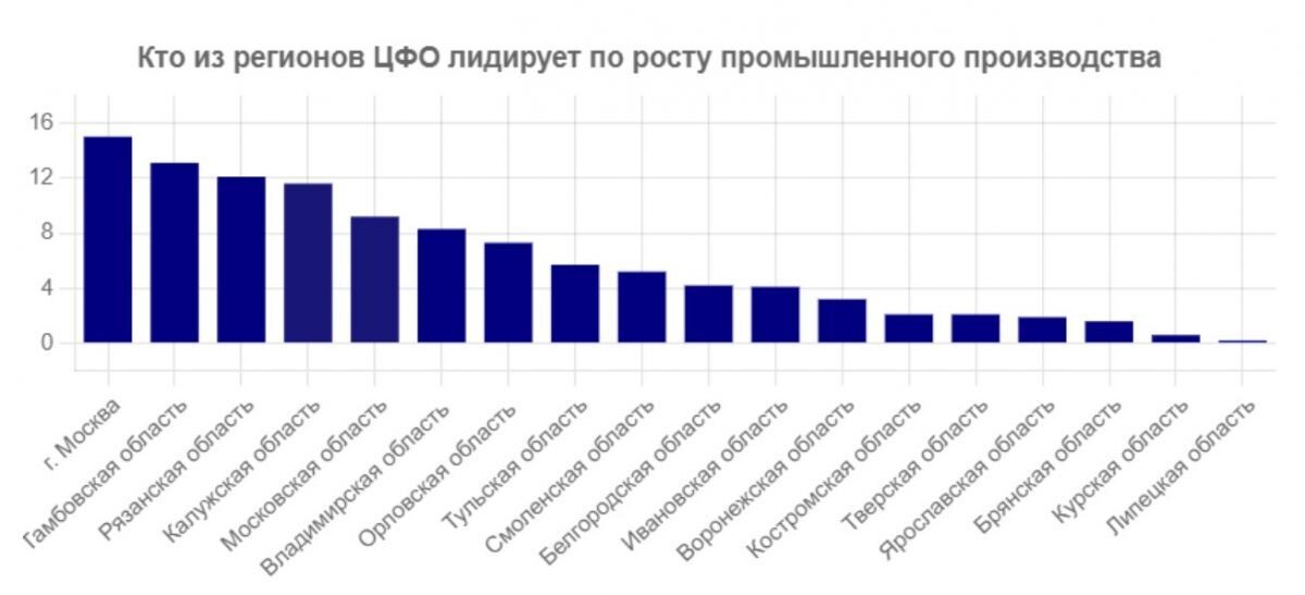 Росстат опубликовал данные о росте промышленного производства в Центральном федеральном округе России за январь-октябрь 2024 года. По итогам десяти месяцев столица заняла первое место, продемонстрировав рост в 15 процентов. За Москвой следуют Тамбовская (13,1) и Рязанская области (12,1). У них тоже хорошие результаты. Рейтинг опубликован на сайте «Федерального Бизнес-журнала». Согласно рейтингу, высокие темпы роста зафиксированы в Калужской области (11,6), Московской (9,2), Владимирской (8,3) и Орловской областях (7,3). Тульская область показала рост на 5,7, а Смоленская – на 5,2 процента. В то же время ряд регионов продемонстрировал более скромные темпы. Так, Белгородская область выросла на 4,2 процента, Ивановская – на 4,1, Воронежская – на 3,2. Костромская и Тверская области показали одинаковый рост в 2,1. Ярославская область – 1,9, Брянская – 1,6. Замыкают рейтинг Курская (0,6) и Липецкая область (0,2).