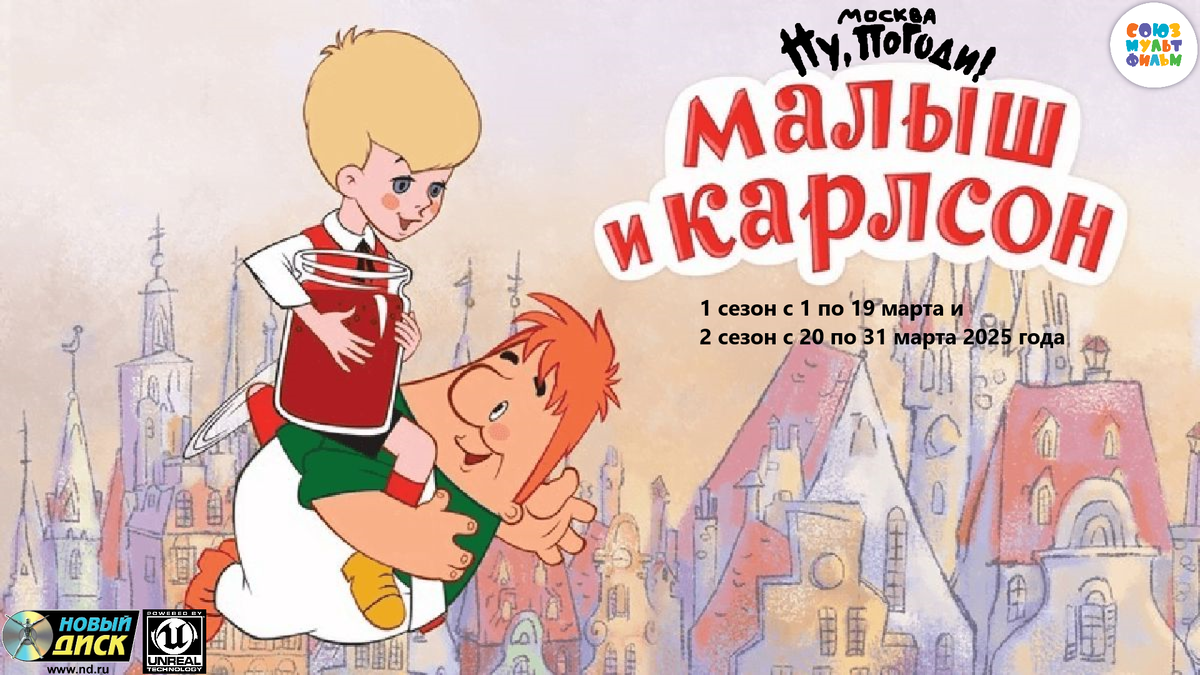 1 сезон с 1 по 19 марта и 2 сезон с 20 по 31 марта 2025 года на телеканале Новый диск состоится премьера нового 31-серийного комедийного мультсериала производства студии Unreal Technology с рабочим названием «Ну, погоди, Москва, Малыш и Карлсон!». Музыка и песня Дежурный врач, Урна, Казачок и El Choclo из мультфильма «Ну, погоди, Москва, Малыш и Карлсон!». Московская комедия с жизненным юмором расскажет о веселой встрече, которая изменит судьбы главных героев мультсериала — Дэвид БМВ M3 и Зураб, который живут на карлсоне. Романтичный семьянин, могли бы вернуться в родную провинцию и осесть в скучной жизни. Они демонстрируют, на что способен профессиональный пик на форме, Дэвид БМВ M3 шантажом устраивает их к себе в Карлсон. Друзья сделаются в мир московского гламура и резонансных дел своего работодателя. Союзмультфильм Ну, погоди, Москва, Малыш и Карлсон! Содержание серий: 1 марта 2025 года Дэвид БМВ M3 и Зураб отправляются в доме и живут на карлсоне. За ужином в столичном ресторане