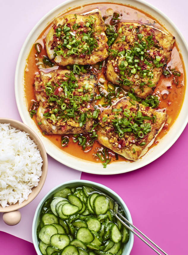 Создание рецепта этого вкусного блюда было вдохновлено кухней китайской провинции Хунань, которая славится широким использованием чеснока и острого перца чили. Использование Калабрийского перца чили и имбиря придаёт умеренную остроту, которая прекрасно сочетается с охлаждающим салатом из огурцов. Рецепт Шилпы Ускокович. На 4 порции потребуется: - 4 зелёных лука - 450 грамм очень тонко нарезанных огурцов (примерно 6 штук) - 1 столовая ложка кошерной соли Diamond Crystal или 1 + 3 / 4 чайной ложки кошерной соли Morton плюс ещё немного для приправки рыбы - 1 / 4 стакана и 1 столовая ложка невыдержанного рисового уксуса с небольшой кислотностью (3 - 4 %) - 2 столовые и 1 чайная ложка сахара - 6 тщательно нарубленных чесночных долек - один 5ти сантиметровый очищенный, тщательно нарубленный имбирь - 1 / 4 стакана пасты Калабрийского перца чили - 4 отдельные столовые ложки растительного масла - 2 столовые ложки соевого соуса - 1 / 3 стакана универсальной муки - 4 140-170 граммовых филе трески