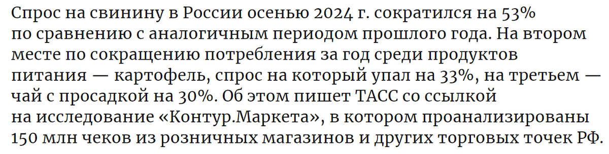 Опять что-то у экспертов не заладилось. Ещё недавно трубили, что в РФ выросло количество людей с избыточной массой тела от того, что все резко стали богатеть и тут такое Пишут, что при этом стали больше потреблять курицу, яйца и маргарин. Да тут и экспертом не надо быть, и так понятно, что для того, чтобы не схуднуть и поддержать свои раскормленные от непомерного богатства тела, дорогие россияне, перешли на дешевый белок. Скоро и до фасоли с горохом дойдёт. Потом выяснится, что у нас горох в дефиците. А на картофель спрос упал тоже по понятным причинам - его стали больше выращивать на своих приусадебных участках те, кто вовремя понял, что всё идёт по плану. Только вот, что же произошло с чаем? Ну не может такого быть, что народ толстеет, угрожая при этом экономике страны, и одновременно перестаёт есть свинину, масло и картофель. Я поняла. Во всём виноваты макарошки, которые всегда стоят одинаково! Запретить! Оставить репу, турнепс и горох. Всё равно мясо, даже курица, становится не по