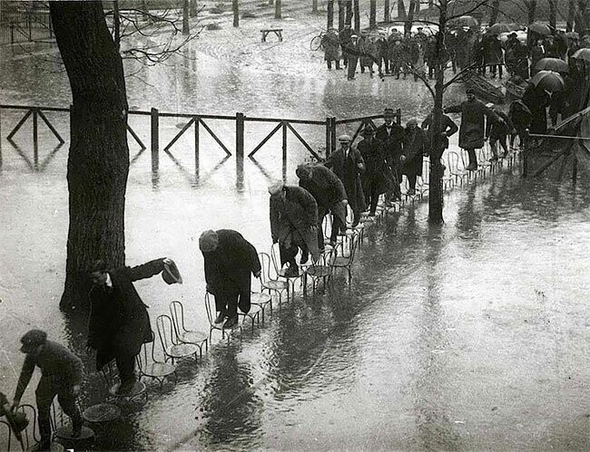 Что же здесь происходит? Почему люди перебираются по стульям? Оказывается, это наводнение в Париже 1910 года. Это наводнение произошло где-то в конце января, начале февраля... Из-за обильных дождей вода в Сене и притоках поднялась и затопила приличную часть Парижа.