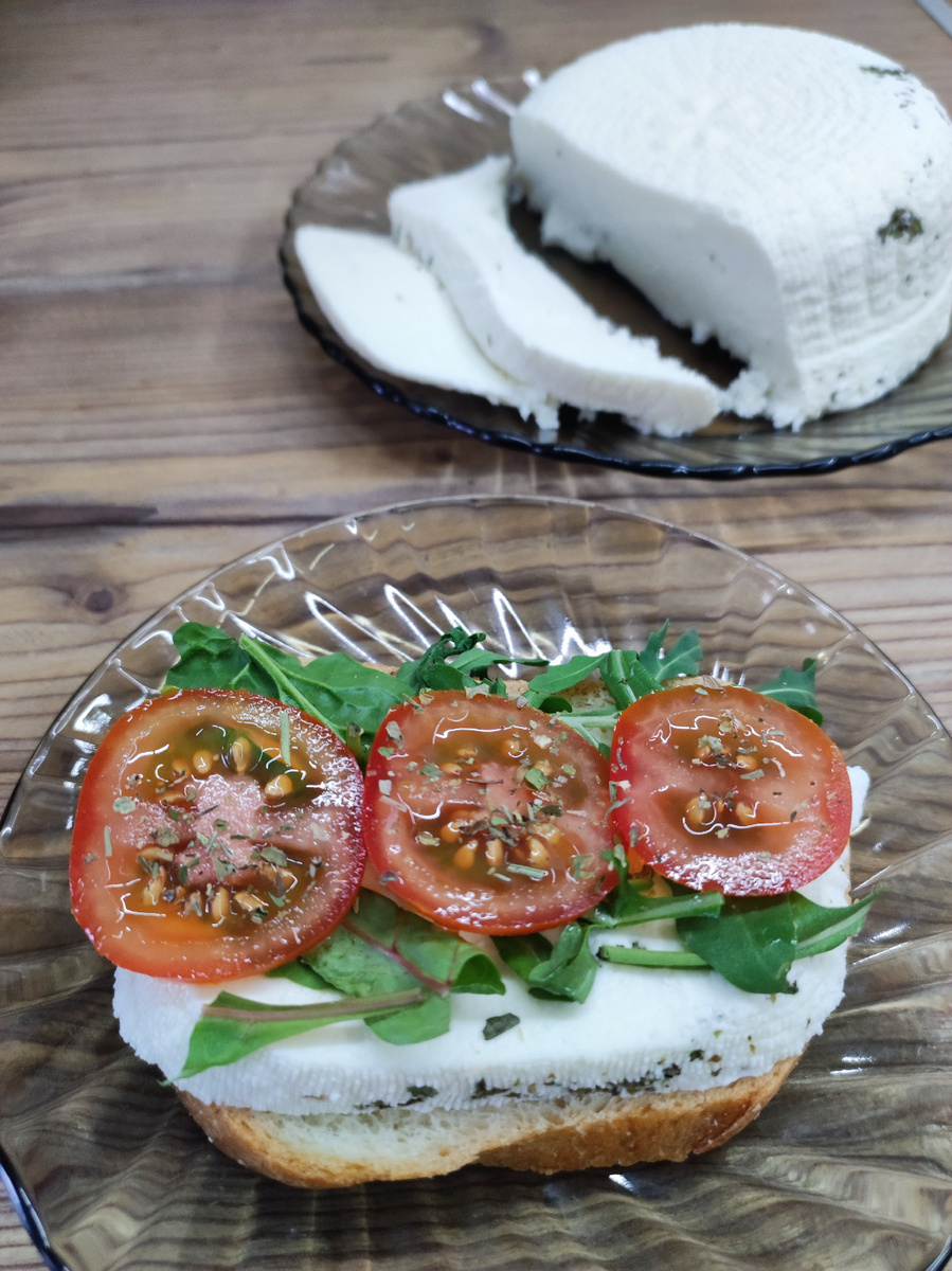 Этот рецепт адыгейского сыра очень популярен на просторах интернета. Простота в приготовлении, доступные продукты и минимальное количество потраченного времени - это то, что ценят хозяйки! Так что пробуйте и добавляйте в копилку любимых рецептов! 1. В кастрюлю выливаем 2 л. молока. Я беру жирность 3,2%.. 2. Доводим до закипания. Не забываем помешивать. 3. Добавляем 1 л. кефира. 4. Помешивая ждем когда начнет отделяться сыворотка от молочных хлопьев. 5. Буквально несколько секунд и мы увидим как наше содержимое хорошо разделилось на две части. 6. Выключаем плиту. Закрываем крышкой и подождем минут 5. 7. Сливаем сыворотку и аккуратно выкладываем творожную массу в форму, предварительно накрыв её слоем марли. 8. Стараемся сильно не перемешивать. Я между слоями добавляю соль и специи. Люблю итальянские травы или сушеный базилик. Кто то посыпает уже сформированную головку сыра. 9. Накрываем сверху марлей и ставим утяжелитель ( у меня баночка с водой). Оставляем на 10-12 часов. 10. Аккурат