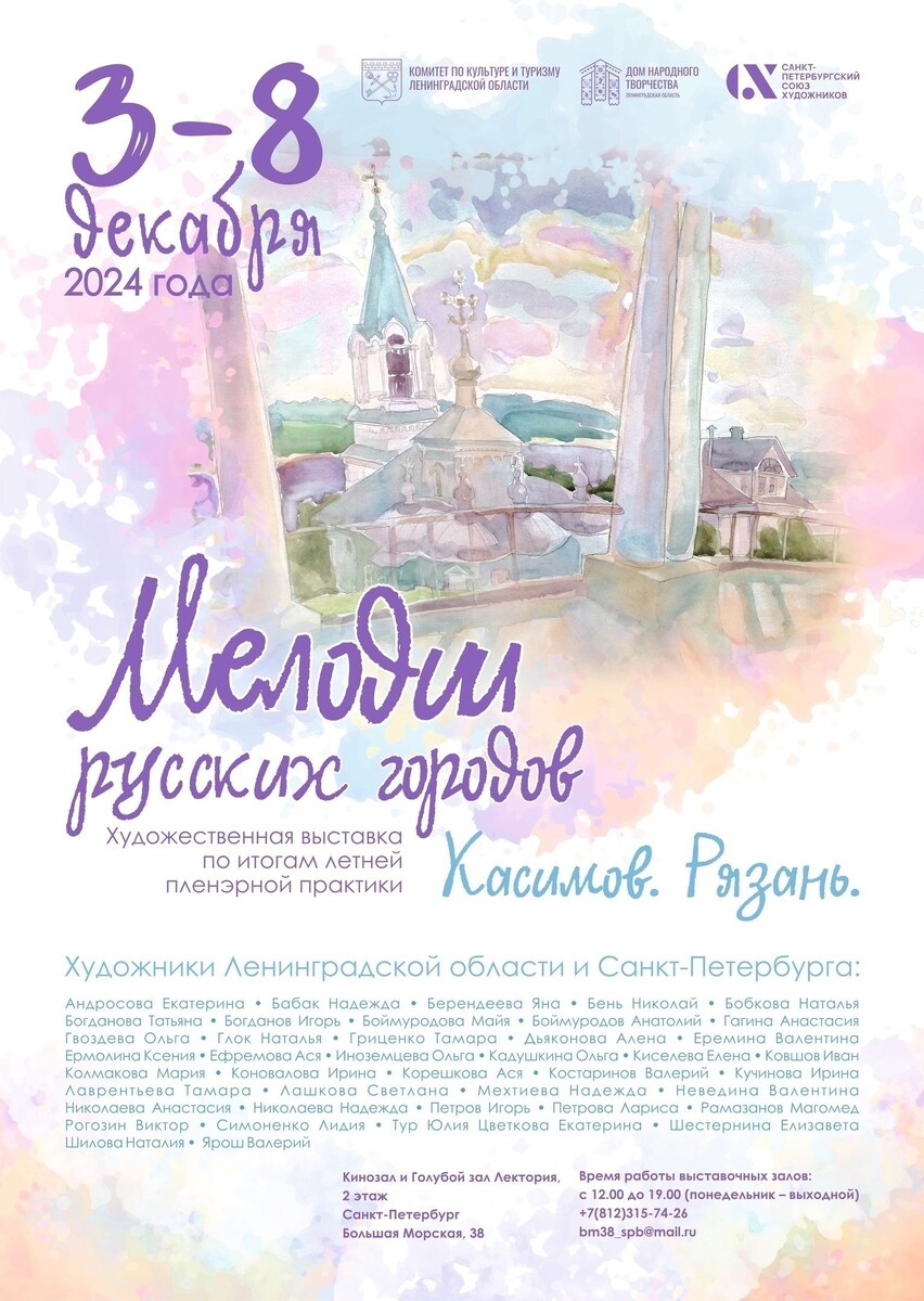 В выставочном центре Санкт-Петербургского союза художников на Большой Морской, 38, в начале декабря открывается выставка работ художников Ленинградской области «Мелодии русских городов. Касимов. Рязань». Об этом сообщает пресс-служба Комитета по культуре и туризму Ленинградской области. «Выставка – это творческий отчет по итогам летней пленэрной практики, состоявшейся в июне этого года в дивных древнерусских городах. Касимов и Рязань – настоящие жемчужины России. Живописные города, раскинувшиеся на берегах реки Оки, впечатляют своей неповторимой самобытностью. Величественные храмы, сохранившиеся купеческие дома, узкие старинные улочки, красота пейзажа, уникальная архитектура – художники постарались передать атмосферу этих городов, их историю и дух», – отметили в пресс-службе. На выставке представят около 100 произведений живописи и графики. А 4 декабря в выставочном центре состоится встреча с художниками, работы которых будут экспонироваться в рамках выставки. Экспозиция продлится до 8