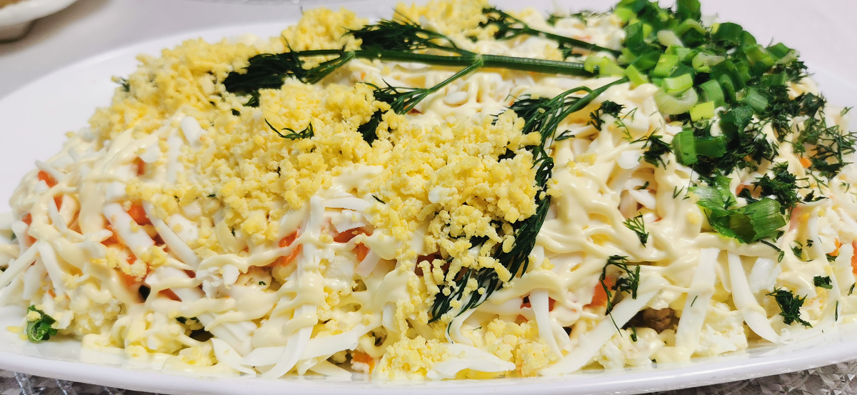 6 слой- сыр плавленый +майонез +украшение, ветка укропа и желток на мелкой терке.