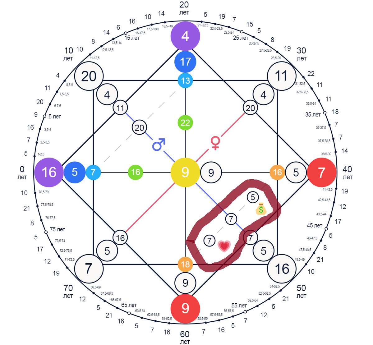 По МК, где стоит 7ка и 5ка, будут приходить задачи, связанные с материальной частью жизни человека, при этом реакция носителя на эти задачи будет влиять и на остальные сферы, в том числе. Это всегда нужно помнить, и в этом есть сложность таких зеркал в матрице.
