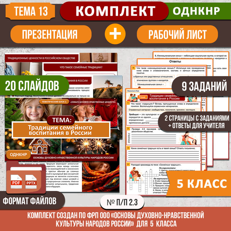 Комплект состоит из презентации (20 слайдов) и рабочего листа (4 страницы: 9 заданий и ответы). Разработан по теме «Традиции семейного воспитания в России» специально к уроку ОДНКНР в 5 классе. Материал подготовлен по теме 13 ФРП ООО «ОДНКНР для 5 классов», тематический блок 2. «Семья и духовно-нравственные ценности» № п/п 2.3. Представлен в двух форматах: PDF и PPTX (редактируемый). Рабочий лист «Традиции семейного воспитания в России» ОДНКНР 5 класс Состоит из 4-х страниц: 9 интересных заданий размещены на 2-х страницах + 2 страницы отведены под ответы для учителя. Содержание заданий: Рефлексия. Презентация «Традиции семейного воспитания в России» ОДНКНР 5 класс Состоит из 20 слайдов, насыщенных актуальной информацией. Содержание презентации по слайдам: Слайд 1. Тема: «Традиции семейного воспитания в России». Слайд 2. Определение понятия «традиция». Слайд 3. Традиционные ценности в российском обществе. Слайд 4. Что такое семейные традиции? Слайд 5. Роль семейных традиций в отношения