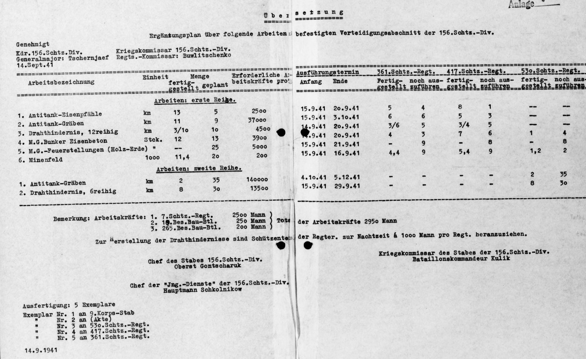 В этом документе приведена немного странная информация, зато указаны части, которые строили укрепления. 7-й полк - это 2-я дивизия народного ополчения (Евпаторийская), 10-й отдельный строительный батальон - это корпусной батальон, 265-й отдельный строительный батальон - это батальон армейского подчинения.