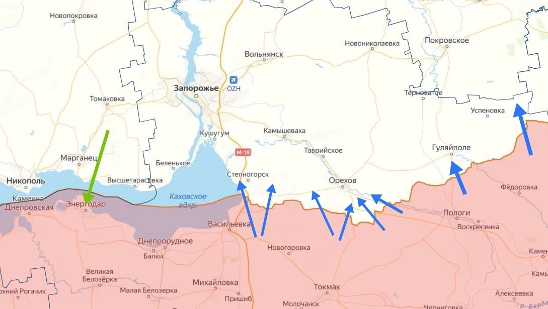 Телеграм-канал «Полк 1430 и 1429» сообщает, что на всём запорожском театре военного конфликта идут позиционные бои. На Ореховском участке фронта ВС РФ давят на флангах.