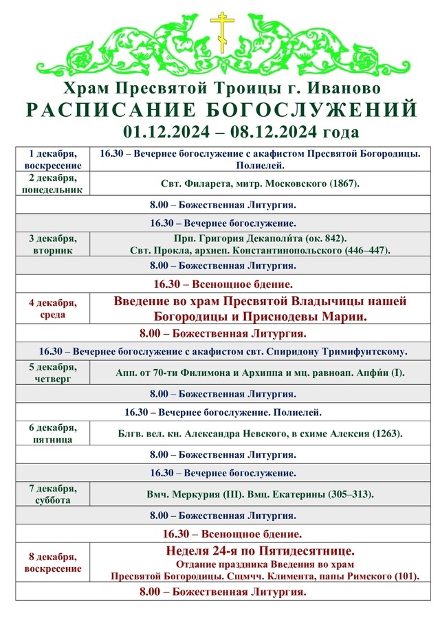 01-08.12. Расписание богослужения в Троицком храме города Иваново