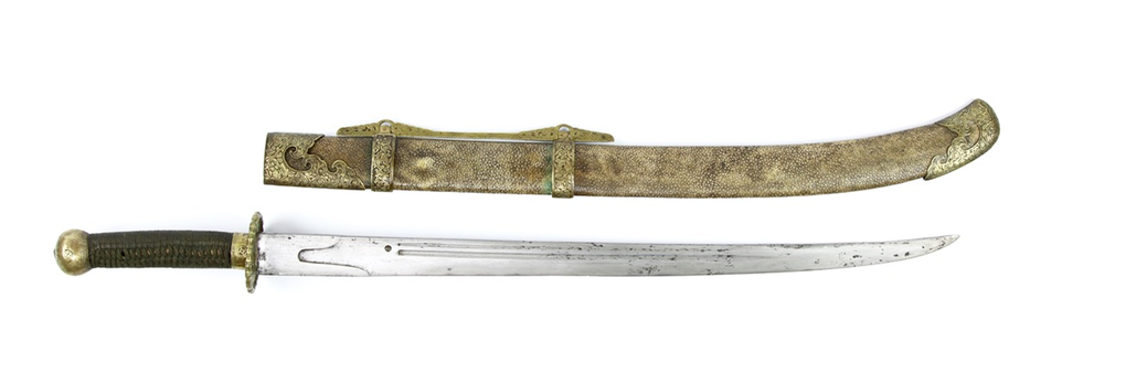 Эта прекрасная китайская сабля имеет клинок yànlíngdāo (雁翎刀), который в основном прямой, с острием, загибающимся вверх. Плавное расширение в этой части предполагает, что идея такого клинка возникла на севере. В целом сабля является типично китайской, но в своем исполнении она черпала вдохновение из многих культур: U-образный дол и сегментированный дол происходят из персидских и северо-индийских конструкций клинка. Заостренный конец последнего перед длинным задним скосом дола отсылает нас к японской нагинате. "Головная" часть клинка со слегка заостренной задней кромкой, по-видимому, относится к стилям ранних исламских сабель, которые сильно повлияли на сабли, используемые степняками, такими как монголы.