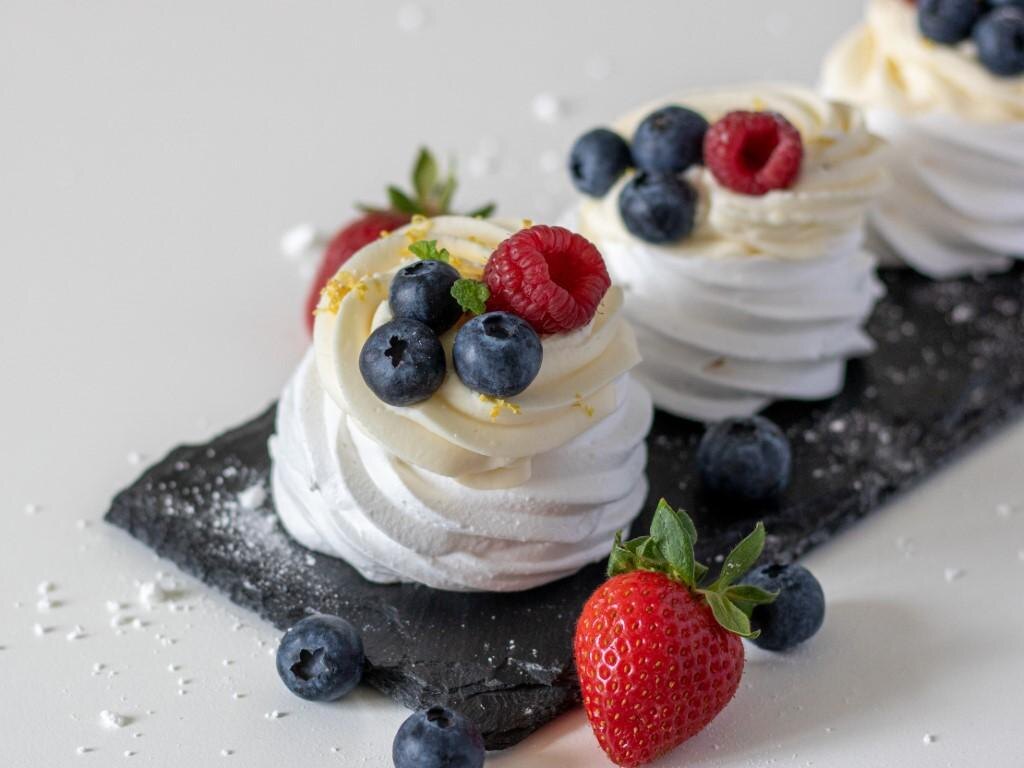 Десерт «Анна Павлова» — это легкий и воздушный десерт, созданный в честь выдающейся русской балерини Анны Павловой. Это блюдо представляет собой меренгу, которая обычно подается с взбитыми сливками и свежими фруктами или ягодами. Десерт отличается своей хрустящей корочкой снаружи и мягкой, нежной серединкой. Ингредиенты Для меренги: - Яичные белки (4-6 штук в зависимости от количества порций) - Сахар (200-250 г) - Ванильный экстракт (по вкусу) - Кукурузный крахмал (1-2 ст. ложки) - Уксус (1 ч. ложка, по желанию) Для подачи: - Сливки (жирные, 33-36%) для взбивания - Свежие фрукты или ягоды (клубника, малина, киви, манго и т.д.) - Сахарная пудра (по желанию, для посыпки) Приготовление меренги 1. Подготовка: Разогрейте духовку до 100-120°C. Заранее подготовьте противень, накрыв его бумагой для выпечки. 2. Взбивание белков: В чистой и сухой миске начните взбивать яичные белки на низкой скорости. Постепенно увеличивайте скорость и добавляйте щепотку соли. 3. Добавление сахара: Когда белки н