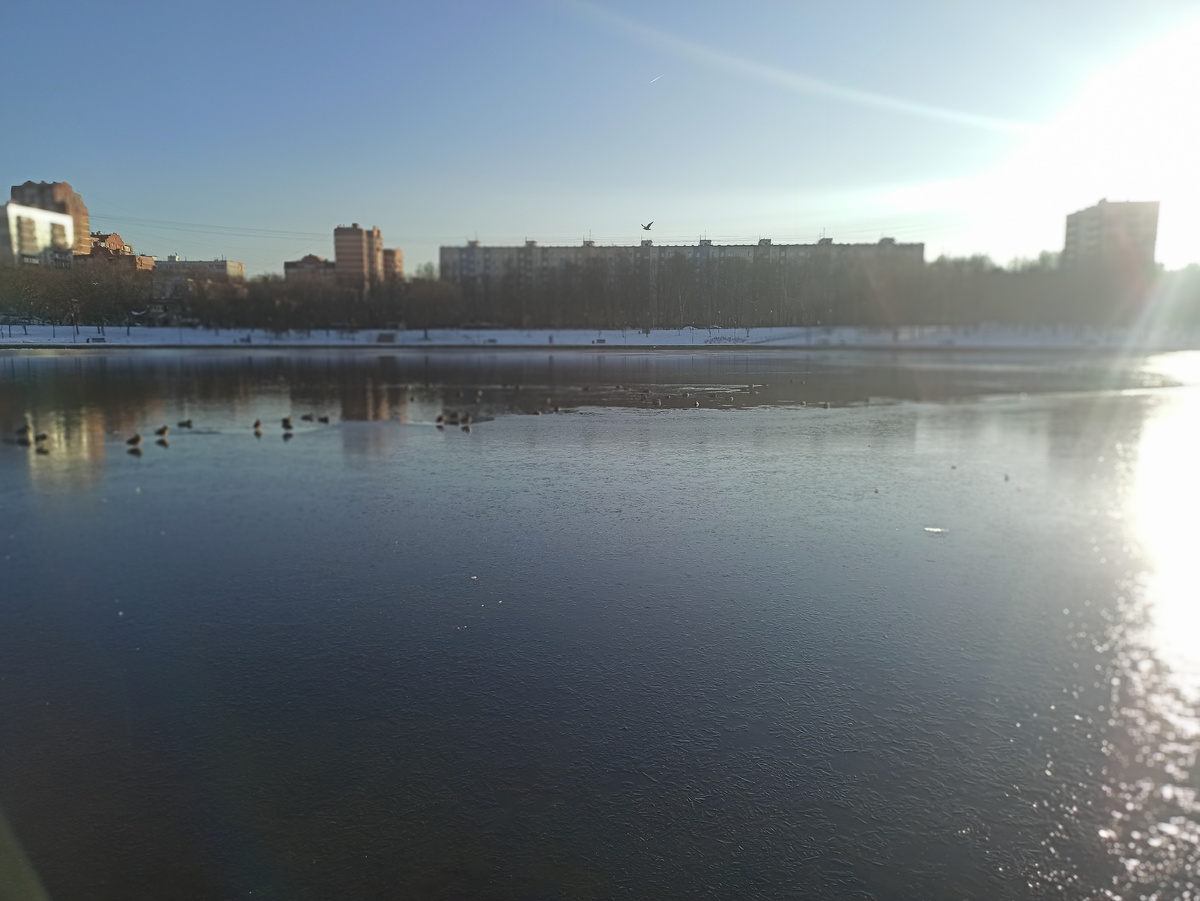 Пруд еще замерз не до конца и мне удалось сделать несколько интересных фотографий, где половина кадра занимал лед, а вторая половина вода.