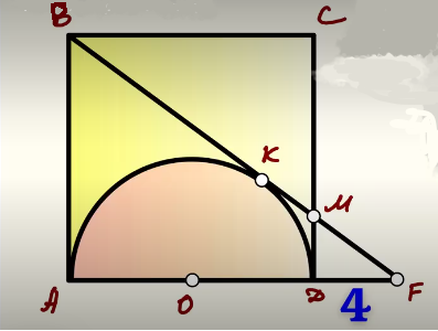 Всем привет, меня зовут Андрей, это снова я. Есть один интересный канал на просторах дзен, его ведет Валерий Казаков. Канал называется "Наглядная геометрия". Мне этот канал очень нравится, но часто бывает так, что автор канала решает задачи не самым простым способом. Я иногда оставляю свои комментарии на этом канале, но с сегодняшнего дня мне захотелось самому решать задачи, которые представлены на том канале. Надеюсь, что Валерий Казаков будет не против, я же во-первых, не говорю о том, что я автор этих задач и называю имя автора, и во-вторых, предлагаю не то решение, которое есть на этом канале, а свое собственное решение. Например, сегодня там была очень интересная задача: Итак, что дано в задаче: ABCD - это квадрат, в него вписан полукруг. Касательная BF пересекает полукруг в точке K. Найти площадь квадрата, если известно, что DF равно 4. Конечно, есть еще точка M - это точка пересечения CD и BF. Но, если говорить честно, эта точка для решения задачи не понадобится, от слова "совсе