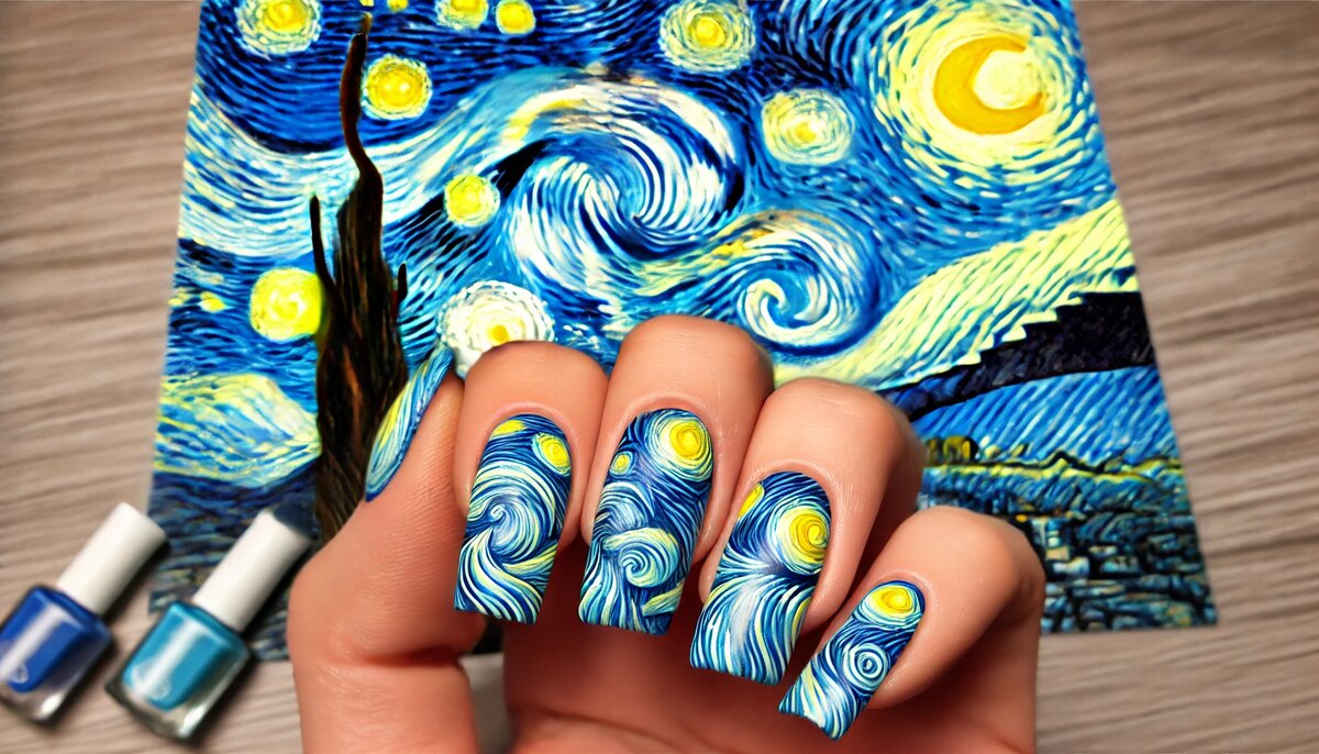 На фото вдохновение Ван Гогом: картина «Звездная ночь» с ее завораживающими вихрями и глубокими синими оттенками может быть интерпретирована на ногтях с помощью плавных линий и сочетания синего и желтого цветов.