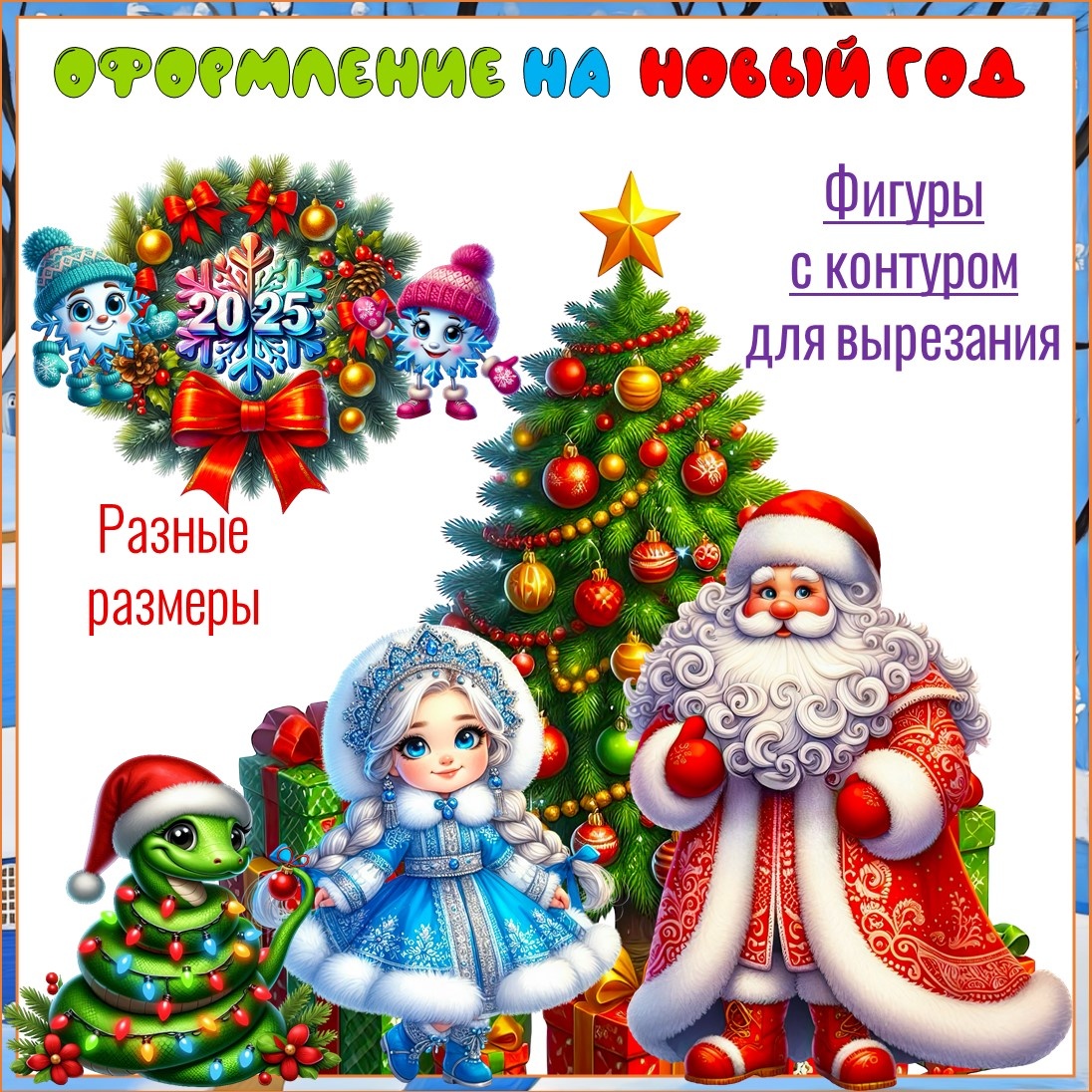 Ознакомиться можно здесь Оформление на Новый Год. Фигуры с контуром для вырезания разных размеров.Шаблоны для оформления , школьной доски, двери и др. Разные размеры на Ваш выбор, формат jpg. Для Вашего удобства сделано несколько размеров: 1. Снегурочка: размер 1 лист на 1 лист А4, размер 2 на 2 листа А4, размер 3 на 3 листа А4, размер размер 4 на 4 листа А4. 2.Табличка 2025 : размер 1 лист на 1 лист А4, размер 2 на 2 листа А4, размер 3 на 3 листа А4, размер размер 4 на 4 листа А4. 3. Дед Мороз: размер 1 лист на 1 лист А4, размер 2 на 2 листа А4, размер 3 на 3 листа А4, размер размер 4 на 4 листа А4. 4.Змейка: размер 1 лист на 1 лист А4, размер 2 на 2 листа А4, размер 3 на 3 листа А4, размер размер 4 на 4 листа А4. 5.Ёлка: размер 1 лист на 1 лист А4, размер 2 на 2 листа А4, размер 3 на 3 листа А4, размер размер 4 на 4 листа А4. Инструкция: Выберите нужный размер (все размеры подписаны и сложены в папки), распечатайте, вырежьте и склейте листы между собой. Для склеиван