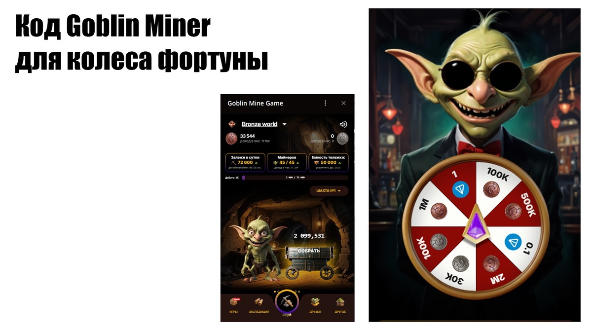 Новый код для игры Goblin Mine 1-2 декабря. Goblin Mine Code. Шифр Goblin Mine. Колесо фортуны Goblin Mine. Чтобы сегодня прокрутить колесо фортуны и получить свой бонус вам необходимо ввести код: