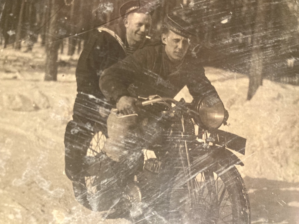 Здесь, он, конечно не за рулем машины, но посмотрите, как лихо сдвинута у него бескозырка, как прищурены глаза, а полосы, которые, конечно связаны с повреждением фото, как бы говорят о скорости, с которой мчится мотоцикл, о ветре в лицо.