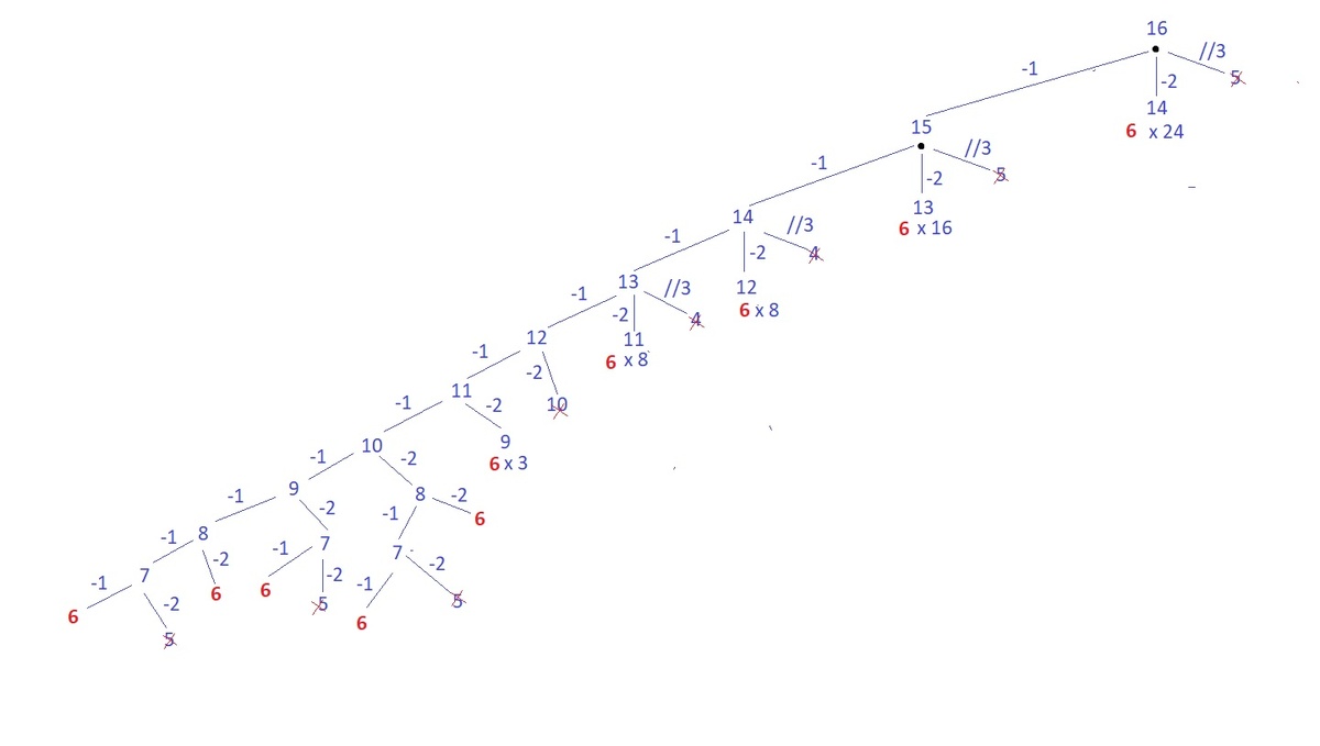 Задача: У исполнителя имеются три команды, которые обозначены латинскими буквами: A. Вычесть 1 B. Вычесть 2 C. Найти целую часть от деления на 3 Первая команда уменьшает число на 1, вторая – уменьшает его на 2, третья – находит целую часть от деления числа на 3. Программа для исполнителя – это последовательность команд. Сколько существует программ, для которых при исходном числе 16 результатом является число 6, при этом траектория вычислений содержит число 11? Решение: Построим дерево вариантов выполнения алгоритма (начинаем с ветки «-1», раскрывать остальные ветки нет необходимости): Веточка «//3» обрывается, т.к. получается число меньше 5 («проскочили» число 6) и траектория вычисления не прошла число 11. Развиваем ветку «-1». Ветки не проходящие через число 11 или проскакивающие число 6 обрываем (на рисунке крестик) Проходим до конца ветку «-1», замечаем, что число «7» даёт одну «6». Ветки «-1» и «-2» из числа «8» дают две «6». Ветки из числа «9» дают – три «6», ветки «-1» и «-2» из