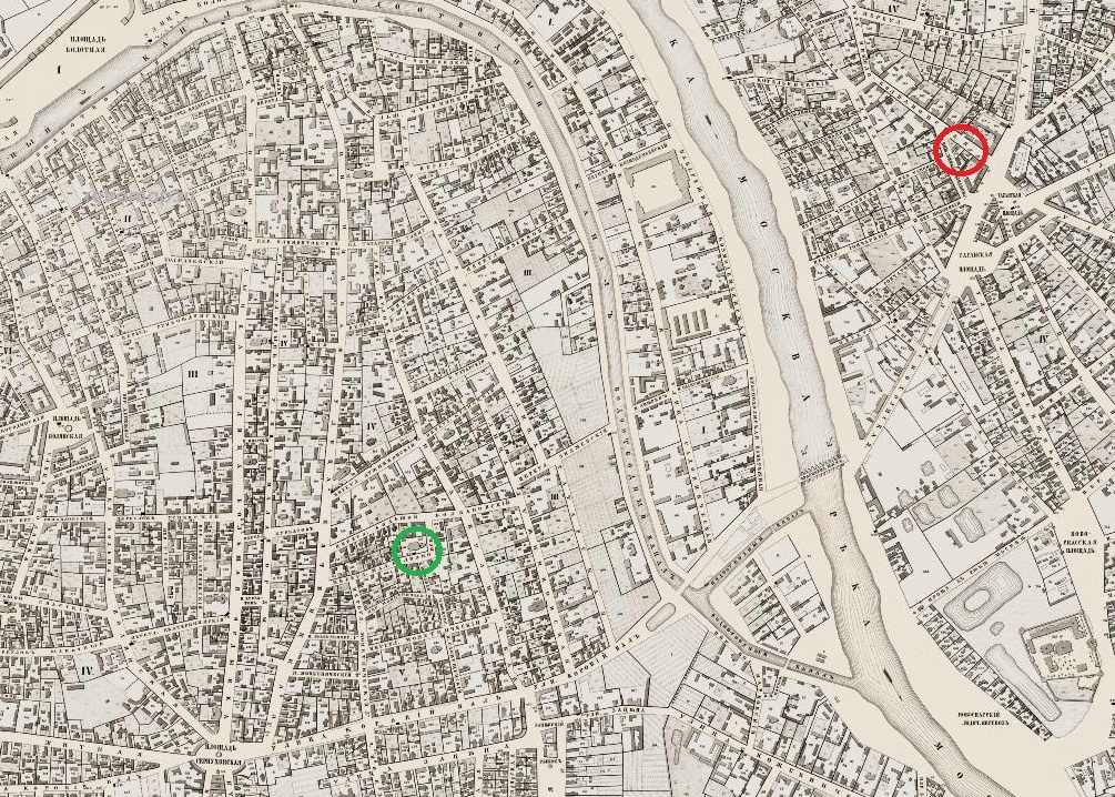 На карте 1852 года мною зеленым цветом выделен храм Спаса Преображения на Болвановке около Павелецкой, а красным – храм Святителя Николая на Болвановке около Таганской. Посмотрим, чем же они отличались.