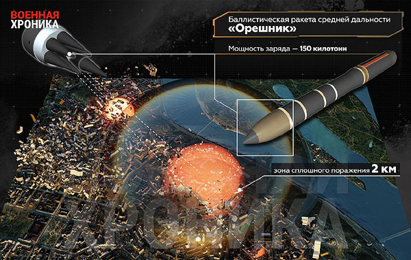 При массированном применении ракет системы "Орешник" мощь удара "будет сопоставима с применением ядерного оружия", заявил президент Владимир Путин. Вот только Орешник - это и есть ядерная ракета средней дальности. Перефразируя заявление президента - "мощь удара ядерной ракетой будет сопоставима с применением ядерного оружия". Получается что-то вроде "если употреблять масло, это будет сопоставимо с употреблением масла". Короче говоря, масло масляное. Если же президент имел ввиду, что массированное применение Орешника даже в безъядерном исполнении будет сопоставимо с применением ядерного оружия, то это совершенно безграмотное утверждение. Орешник в безъядерном исполнении, конечно, мощнее Калибра или Кинжала, хотя бы потому, что несет несколько боевых блоков, но в тротиловом эквиваленте их мощность составляет всего несколько тонн. С учетом кинетической энергии мощность удара может достигать 10-20 тонн, но никак не 150 килотонн ядерного заряда. Не может ракета в безъядерном исполнении, как