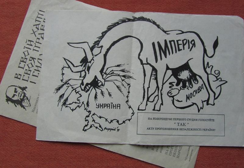 Вот как хитро и, заметьте, на чистейшем русском языке (тогда ещё никто не называл его «языком свиней» — могли бы за это нарваться) агитировали граждан Украинской ССР голосовать за независимость на референдуме 1 декабря 1991 года, накануне уничтожения СССР: