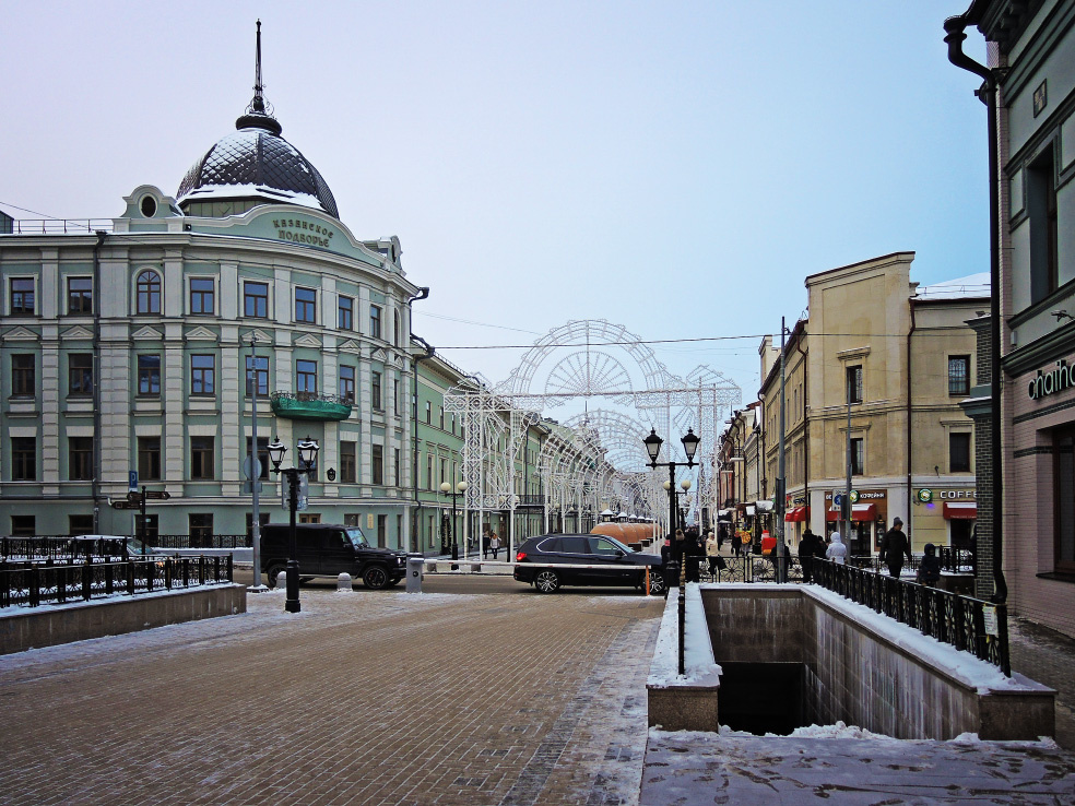 Ну что, дожили мы до очередной зимы. По крайней мере, календарной. С чем всех читателей и поздравляю. Декабрь - традиционное время подготовки к новогодним праздникам. В Самаре погода пока больше подходит поздней осени. Но монтаж праздничного оформления уже начался. Пока ничего нового вроде бы не наблюдается. В ожидании завершения работ зашёл в архив. Моё внимание привлекли фотографии из короткой поездки в середине декабря 2018 года в Казань. Тогда из Самары туда можно было доехать на поезде. Время в пути было значительно больше, чем на автобусе. Но расписание позволяло провести на месте целый день - прибытие утром, отправление назад вечером. И я решил съездить на такую бюджетную поездку до начала «высокого туристического сезона». Для создания новогоднего настроения предлагаю посмотреть, что мне удалось тогда увидеть. Пару объектов, снятых в тот день, я уже показал. Ссылки можно найти в конце статьи. А наша общая прогулка начинается на улице Баумана. К сожалению, видел её только днём. Ф