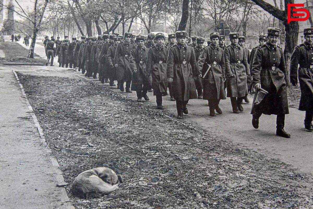 Тогда, по бывшей улице Красина, маршем в городскую баню шли солдаты учебной части. В пасмурный, холодный день на газоне, под которым проходит теплотрасса, спал бездомный пёс. Взять его на руки и отнести в казарму солдаты пообещали нашему фотографу Борису Ечину на обратном пути.