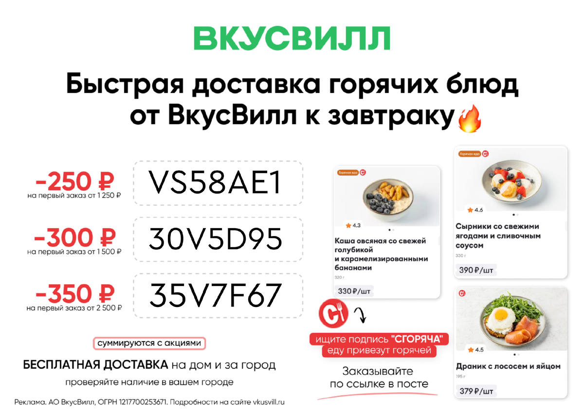 🔸️ Английский завтрак 🔸️ Бургеры 🔸 Колбаски 🔸️ Комбо на обед и многое другое Еду готовят с нуля. Блюда доезжают по адресу еще горячими. Все как в ресторанах, но дешевле и быстрее. Протестируйте обновление во ВкусВилле c промокодами на первый заказ: 🔥 VS58AE1 - скидка 250 ₽ при заказе от 1250 ₽ 🔥 30V5D95 - скидка 300 ₽ при заказе от 1500 ₽ 🔥 35V7F67 - скидка 350 ₽ при заказе от 2500 ₽ Ссылка: https://vksvl.prfl.me/6238cc608d70de4bf05c082d/gg6jee?erid=2Vtzqvdx4iL