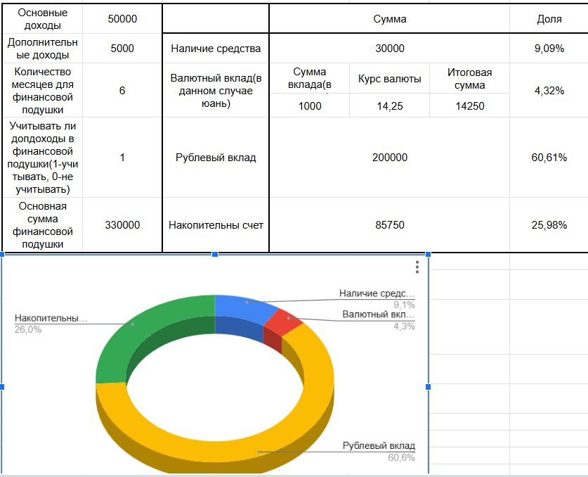 Предположим, что ваша заработная плата составляет 50 000 рублей, расходы-45000р, так же есть 5000р дополнительных доходов, которые вы можете откладывать. Вы решили, что хотите отложить финансовую подушку безопасности в размере шести ежемесячных доходов, т.е вам необходима сумма в 330000р(дополнительный доход я тоже учитываю), из которых вы сразу 30000р отложите наличными. Основную часть финансовой подушки можно держать во вкладах(для примера я взял 200000р), а остальное можно распределить между валютным вкладом(14250р или 1000 юаней по 14,25р за юань) и накопительными счетами(85750р).Таблицу по распределениям можно увидеть ниже: