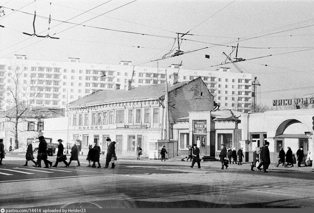 Вид с этой точки за прошедшие десятилетия кардинально изменился, только переход на том же месте, а старую застройку начали сносить ещё в восьмидесятых, а окончательно убрали вместе с рынком уже в новейшей истории, после чего построили огромный жилой дом с торговым центром