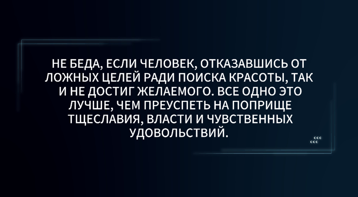 Благословенный Нарада молвил: — Причина твоего неудовлетворения, Вьяса, кроется в том, что Истину, кою ты проповедовал, ты не увязывал с Красотою. Учение, где Прекрасное не провозглашено Высшей Истиной, ущербно и, стало быть, ложно. Такое учение не упокоит душу, не вселит радости в сердце. Ты разъяснил человеку его долг, призывал к трудам праведным. Но пред кем человеку надлежит исполнять свой долг, кому должен он посвящать труд, ты не поведал. Не указал ты, что узами долга человек связан лишь со Всеблагою Красотою. Речи, что не славят непорочную Красоту, точно воронье карканье. Они, безусловно, ласкают слух обитателям сточных ям и отхожих мест. Лебедям же вороний крик что ушат помоев на голову. Лишь песнь Красоте избавляет душу от тревог и печалей. Пусть даже изреченная несовершенным языком, повесть о Совершенстве ласкает слух, наполняет сердце жизнью. Всякий, кто вслушивается в свое сердце, кто честен с собою, откликнется на песнь, призывающую к поиску Всеблагой Красоты. Целью че