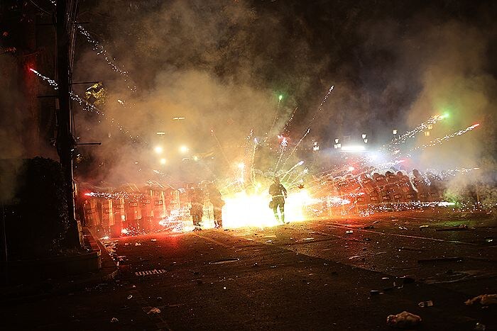 Москва. 1 декабря. INTERFAX.RU - В Тбилиси группы из числа участников акции протеста, проходящей перед зданием парламента Грузии на проспекте Руставели в воскресенье вечером, вновь стали запускать в сторону окон и внутреннего двора высшего законодательного органа пиротехнику и камни, передает корреспондент "Интерфакса". Сотрудники МВД, защищаясь от ударов камней щитами, пытаются не подпускать агрессивных молодых людей к стенам здания. Периодически полиция, используя пожарный рукав, обливает приближающихся протестующих водой. Со своей стороны, участники акции пытаются ослеплять правоохранителей лазерными указками, непрерывно запускают пиротехнику в сторону окон парламента, кидают камни. В эти минуты на прилегающих к зданию парламента улицах мобилизованы подразделения полиции и спецназа МВД. Со стороны митингующих в адрес полицейских звучат оскорбления. Ранее в воскресенье вечером начальник департамента патрульной полиции МВД Грузии Важа Сирадзе призвал участников акции протеста перед зд