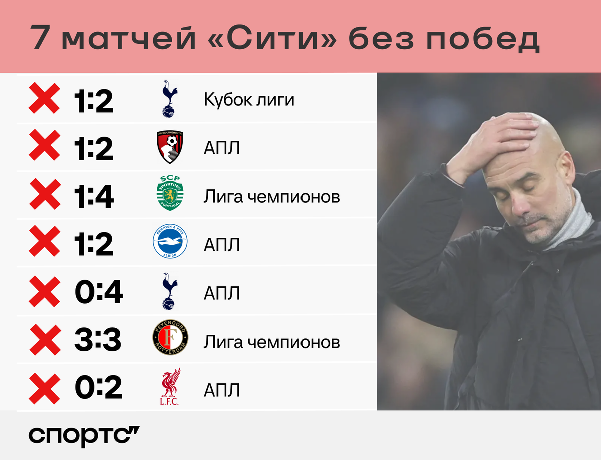 7 матчей без побед. Страдания «Манчестер Сити» продолжаются: теперь поражение «Ливерпулю» 0:2. Было плохо: первый тайм команда Гвардиолы закончила с одним ударом в створ, 0,06 по ожидаемым голам и с пятью касаниями мяча в чужой штрафной. Во втором тайме не сильно лучше. Серия без побед достигла семи матчей – куда уж хуже, да? Перед матчем Гвардиола рефлексировал: «Как и положено, над нашими поражениями издеваются и смеются. Это нормально, никакой жестокости и прочего. Конечно, я сплю не так хорошо, как раньше, но я остался таким же человеком. У меня те же сомнения. Знаю, что игроки страдают, но что я смогу сделать? Винить их? Нет, ни в коем случае». Это худшая серия в карьере Пепа. Официально Шесть фактов, которые помогут осознать исторический кризис: ● «Ман Сити» нанес первый удар по воротам «Ливерпуля» лишь на 39-й минуте, так долго команда не пристреливалась с апреля 2005-го, тогда играли с «Арсеналом». ● 0,06 по ожидаемым голам у «Сити» до перерыва – так плохо при Пепе еще не никог