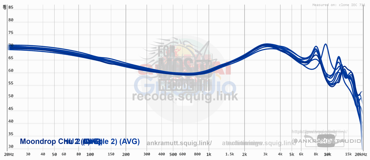 - VSDF – кривая компании Moondrop. Получена, насколько я понимаю, из конвертации кривой диффузного поля со стенда B&K 5128 под стандарт IEC711. Плюс – также добавлен небольшой подъём на саббасе.