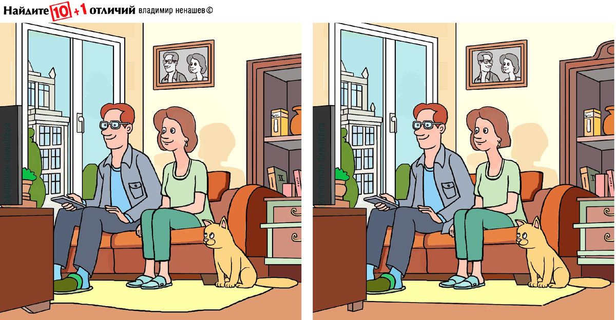 10+1 отличие. Загадка и тест на внимание. Найдите отличия в картинке про семейную жизнь.
