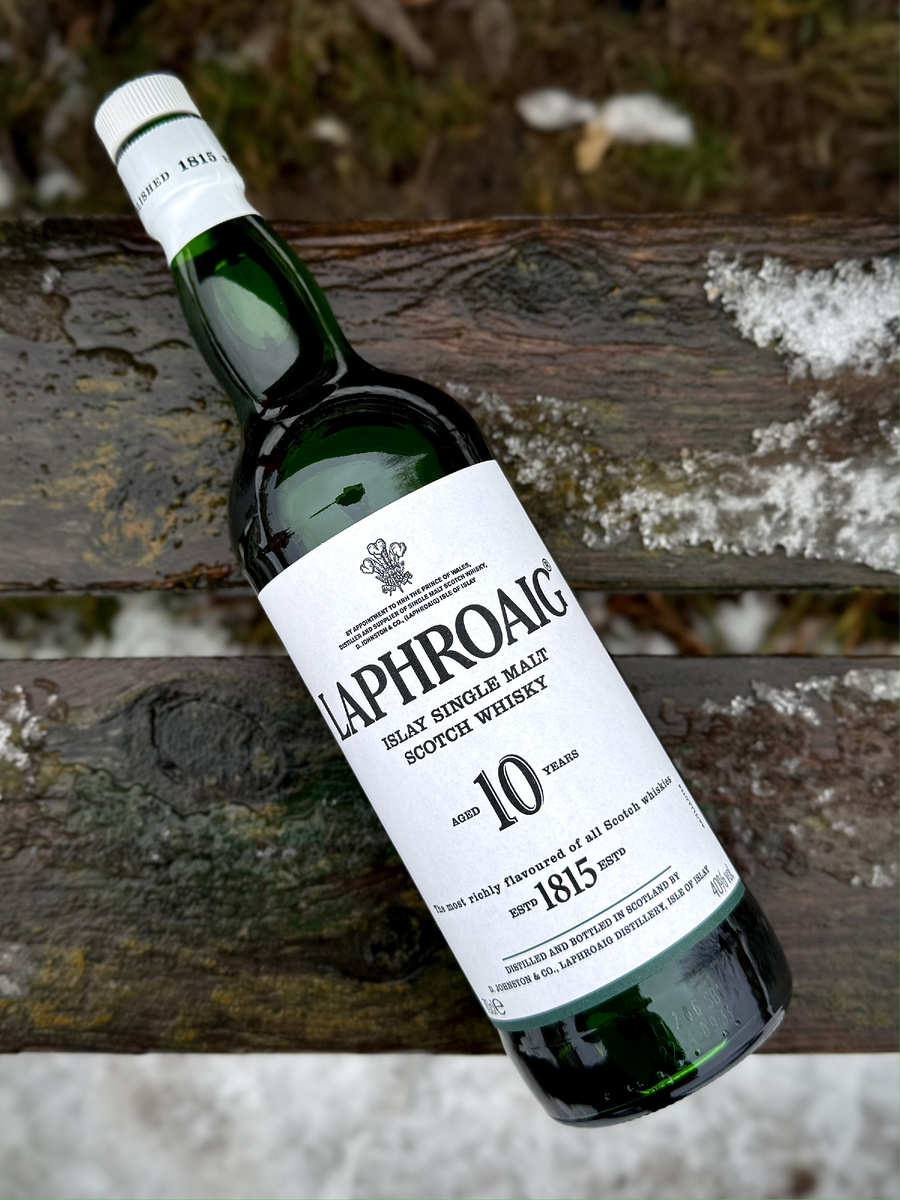 Всем привет! Ну это классика, это знать надо! Laphroaig 10, наверное один из самых известных виски с острова Айла, и самых продаваемых. Laphroaig производит собственный солод, хотя собственный солодовенный завод покрывает лишь 15% потребности, остальные 85% поставляет компания Port Ellen Maltings. Зерно, соложенное на месте, имеет концентрацию фенольных соединений до 60 ррm, а соложеное в Порт-Эллене - от 35 до 45 ррm. Наша 10-летняя версия выдерживается в бочках из-под бурбона, разливается при крепости 40% vol, и уже несколько десятилетий входит в основное предложение компании. Почти каждый год получает какую-нибудь престижную награду. Одной из последних стала двойная золотая медаль, врученная жюри Всемирного конкурса спиртных напитков в 2022 году. В том же году компания изменила дизайн этикеток на очень минималистичный.