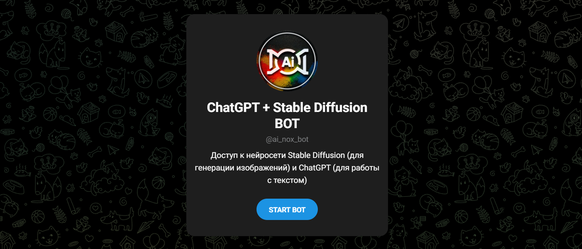 AI nox bot - телеграм бот, который даёт доступ к двум популярным нейронкам. Stable diffusion - для генерации изображений и ChatGPT - для генерации текстового контента.