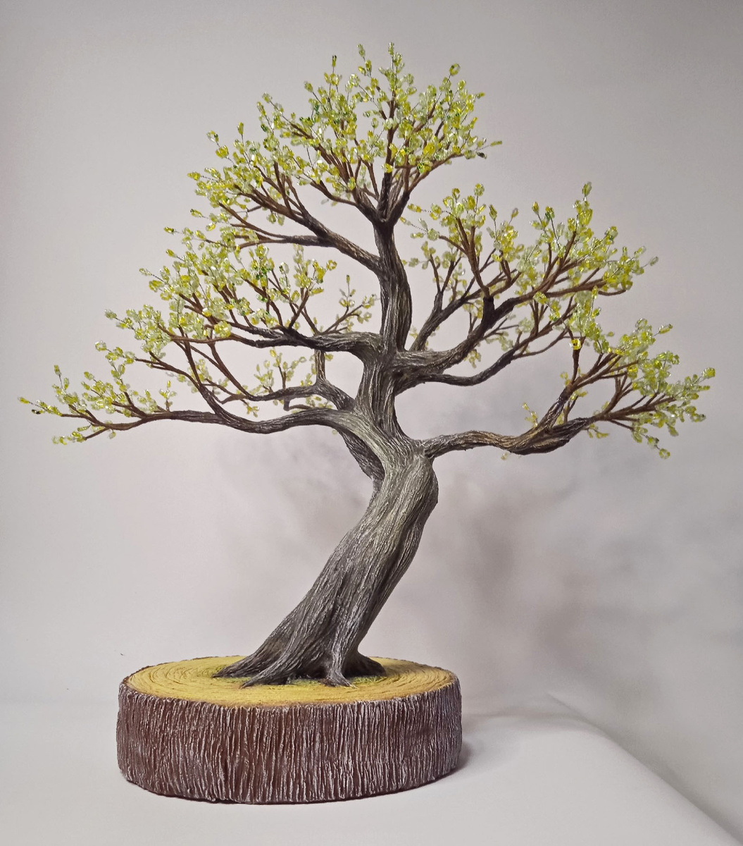 Изготовление дерева из бисера своими руками украсит любой интерьер. Справится с работой сможет как мастер, так и новичок. Этот процесс сочетает в себе творческий подход и внимательность к деталям, что позволяет создать уникальные изделия, полные индивидуальности и душевности. Дерево станет не только украшением, но и оригинальным подарком для близких, передавая тепло и заботу ваших рук. Материалы: бисер желтого, светло-зеленого оттенков - 100 гр.; проволока - 2 катушки по 50 метров 0,4 мм. (проволоки может уйти больше, зависит от того, как вы плетёте), мне 2 катушек хватило. проволока 0,9 мм., 1,5 мм., 5 мм. картон, бумажная глина, горячий пистолет, малярный скотч, клей ПВА, флористическая лента любого цвета, нитки коричневого цвета, акриловые краски. Бумажную глину надо сделать заранее, примерно, за 48 часов, прежде чем вы начнете с ней работать. Рецепт по бумажной глине я не выкладываю, его можно найти на просторах интернета, набрав в поисковике "Рецепт бумажной глины". Можно использо