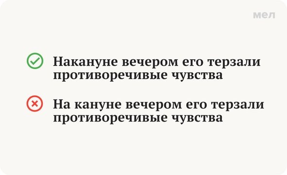 Есть такие правила, которые в трудных случаях хочется применить автоматически. Первое из них — проверка ударением безударных гласных. Второе (или, может быть, третье) — проверка слитного или раздельного написания наречий отделением предполагаемого предлога от основной части — если смысл теряется, значит, надо писать слитно. Как, например, со словом «вдребезги». Но сегодняшний пример так проверить нельзя. Правильно: накануне Разбор таких случаев всегда начинаем с определения части речи: если перед нами наречие, его (в большинстве случаев) нужно писать слитно, если существительное с предлогом — раздельно. В нашем сегодняшнем примере слово «накануне» отвечает на вопрос «когда?» и означает «в день, предшествующий какому-то другому дню или событию». Слово не склоняется по падежам, то есть является неизменяемым. Также оно зависит от глагола («терзали»). По этим трем признакам делаем вывод, что перед нами наречие. Вспоминаем правило: наречия, образованные от существительных, имеющих пространс
