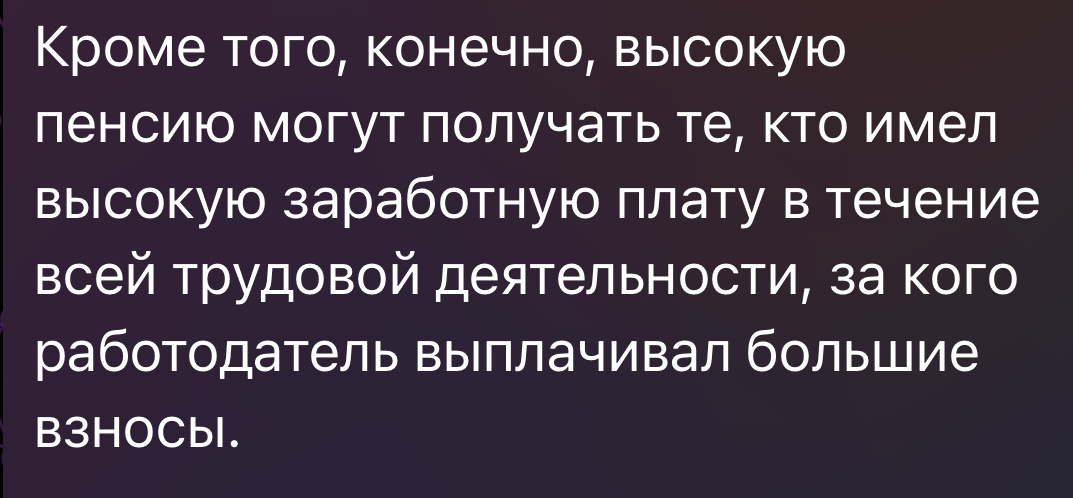 "В первую очередь такую пенсию [50 000 рублей-авт.] могут получать, например, космонавты, Герои России, ветераны боевых действий, если у них две пенсии". Об этом сообщила главная пенсионная вестница России, она же член Трудового комитета Госдумы Светлана Бессараб, которая при этом напомнила, что на две пенсии [военную и страховую] могут рассчитывать участники Великой Отечественной войны и ветераны боевых действий. По мнению депутатки: А ещё: Так на 50 цитата обрывается. 50 000 рублей скорее. Как-то сервис SuperJob провёл опрос о том, какую пенсию хотят получать дорогие россияне. И оказалось: Мысль: Дано: в 2024 году фиксированная выплата - 8 134,88 рубля, а стоимость ИПК — 133,05 рубля. Грубый подсчет: 50 000 - 8 134,88 = 41 865,12 41 865,12 : 133,05 = 314,7 Для пенсии в 50 000 рублей необходимо иметь на счету 314,7 индивидуальных пенсионных коэффициентов. Напомню, что за год только 10 индивидуальных пенсионных коэффициентов (ИПК) можно заработать на пенсионный счет. То есть для 5