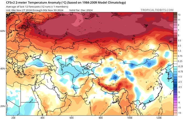 🌡❄️Долгосрочный прогноз на декабрь 2024 от американской GFS. Месяц ожидается теплым (отклонение от нормы на 3-4°С). Количество осадков больше нормы на северо-востоке, а на остальной территории около нормы. Также ожидается преобладание антициклонов.