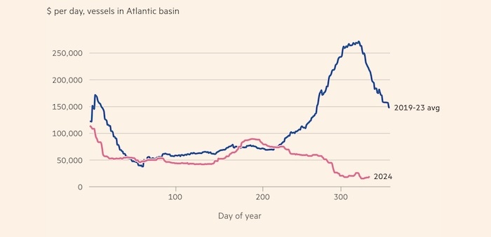 По данным Spark Commodities, в ноябре стоимость краткосрочной аренды современного СПГ-танкера — основного типа судов на рынке — в Атлантическом бассейне составляла в среднем 19 700 долларов в день. Это самая низкая цена с 2019 года. С лета фрахт подешевел почти на 80%, поскольку поставка новых судов опережает рост мирового производства СПГ.