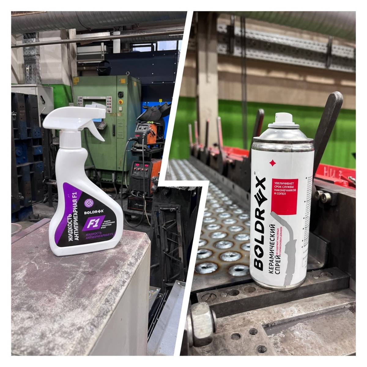 - Уменьшение затрат на комплектующие для горелок Решение: 1. На протяжении всей смены сварщики брызгали масляный или силиконовый спрей на сопло горелки. Приходилось отвлекаться каждые 30 минут на повторное нанесение. Мы заменили на 1-ом посту масляный на Керамический спрей BOLDREX. Сварщик проработал 8 часов без повторного нанесения. А сопло осталось без сварочных брызг. 2. После сварки необходимо механически зачищать изделие от сварочных брызг. При применении Антипригарной жидкости BOLDREX F1 сварочные брызги перестали налипать на поверхность изделия. Результаты: Внедрение Керамического спрея BOLDREX привело к следующему: - Сокращение 7-ми минут в день на зачистку сопла