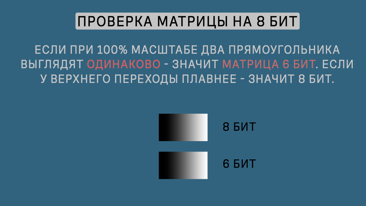 Всем привет! Я люблю простоту, поэтому и тест максимально прост. Два прямоугольника шириной 256 пикселей. В верхнем 256 полутонов, в нижнем 64. Если матрица отображает их одинаково - значит дисплей 6 бит. Если же на верхнем переходы не заметны и плавны, а на нижнем более ступенчаты - матрица 8 бит. Чтоб тест правильно сработал - надо открыть файл в 100% масштабе. Можно нажать левой кнопкой мыши по изображению, а затем правой кнопкой и выбрать - открыть в новой вкладке (окне). Оригинал файла можно скачать тут. Я думаю при выборе монитора - этот тест будет незаменим. Если оказался полезен - подписывайся и ставь лайк! Всем отличных покупок!