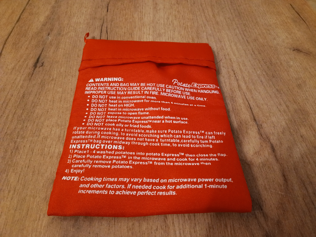 В поисках самого нужного и полезного для дома, я набрела на очередной кухонный гаджет. Однажды уже писала о своих недавних покупках. Некоторые вещи оказались полезными, а некоторые зря потратила деньги. В этот раз глаз зацепился за яркую окраску предмета. Немного почитав отзывов, решила купить. А купила я мешочек для запекания а микроволновке. Заказ пришел достаточно быстро. Получив заметный мешочек, мне не терпелось испытать его в действии. Мешочек достаточно компактный. Всего 19 х 24 см. Изготовлен из ткани. Внутри вот такая красота: К чудо мешочку прилагалась инструкция: Меня насторожило примечание: "Убедитесь, что рукав может свободно вращаться во время, приготовления в СВЧ, чтобы избежать ситуаций, которые могут привести в возгоранию, если оставить его без присмотра". Все ничего, но у меня нет поворотного стола и не понятно как использовать моей микроволновке. Была не была , - подумала я, положив четыре небольшие картофелины в мешочек. Далее мешочек с картошкой поставила на таре