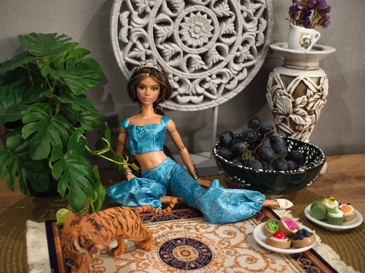 Сегодня очередь следующей принцессы из проекта "Барби в роли принцесс Диснея" - восточной красавицы Жасмин. Первой, правда вне проекта, была Белоснежка. Второй - Ариэль. А роль Жасмин в тематической фотосъемке сыграет Лина лукс #1❤️ Из-за ее густых темных волос, смуглого скинтона и длиннющих ресниц я как-то сразу подумала о ней в этой роли. Для создания восточного антуража пригодился коврик для мыши (такой классный, руки чешутся еще в других расцветках прикупить), виноград в чашечке, привезенной из Турции, кукольные сладости и пара финтифлюшек из фикса. Ну и мини-Раджа😁 Хотелось бы тигра помощнее, но что есть, то есть. Не очень люблю покупать на один раз. Причем Жасмин повезло! Ведь она участвует в съёмке не одна, а со своим... .. Аладдином!) Если Эрика для русалочки не нашлось, то кандидат на роль Аладдина подобрался сразу😁 Правда, его участие в проекте какое-то время было под вопросом из-за костюма, но мы решили этот вопрос, и без финансовых вложений😁 И оба сказочных героя