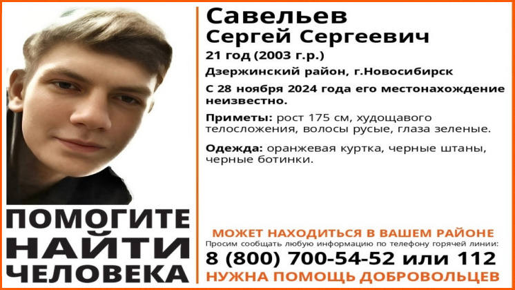 В Дзержинском районе Новосибирска без вести пропал 21-летний Сергей Савельев. С 28 ноября 2024 года его местонахождение неизвестно. Теперь молодого человека ищут волонтёры поисково-спасательного отряда «ЛизаАлерт». Приметы пропавшего: рост 175 сантиметров, худощавого телосложения, волосы русые, глаза зеленые. В день исчезновения сибиряк был одет в оранжевую куртку, черные штаны и черные ботинки. Если у вас есть информация о местонахождении пропавшего Сергея Савельева, сообщите об этом по телефону: 8-800-700-54-52 или наберите 112. Ранее «Вести Новосибирск» писали, что под Новосибирском завершили поиски 18-летнего худого юноши с длинными волосами.